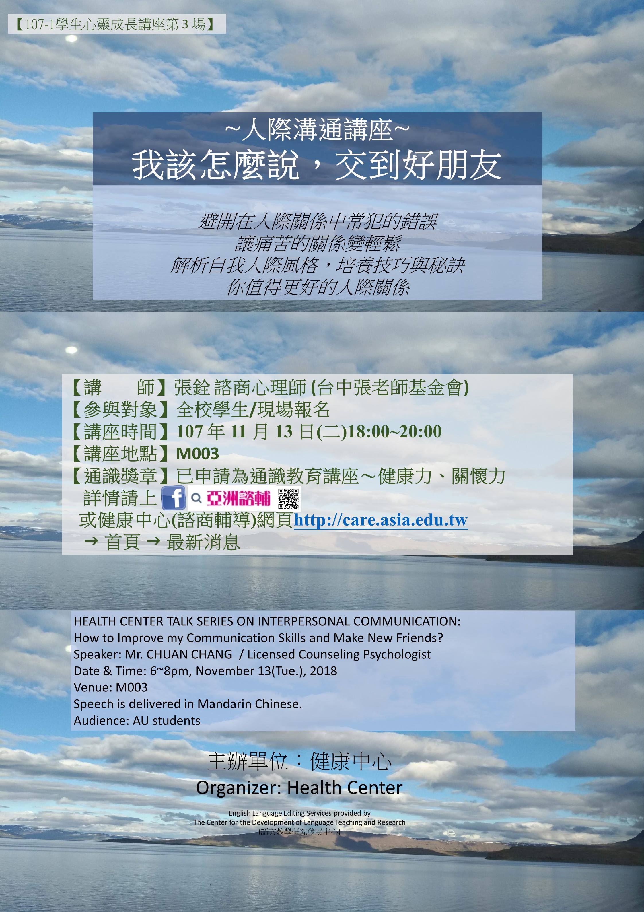 【107-1】人際溝通講座─我該什麼說,交到好朋友 107/11/13(二),18:00-20:00,M003